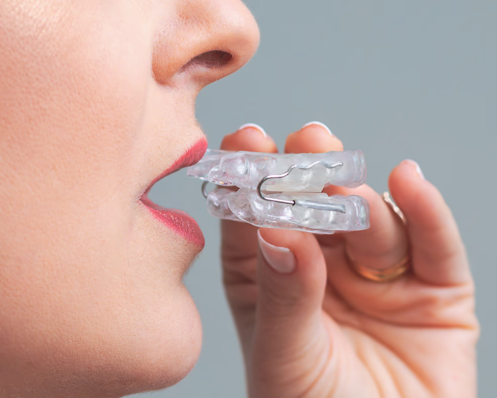 Aparelho intraoral abrindo a via aérea de pessoa com apneia do sono