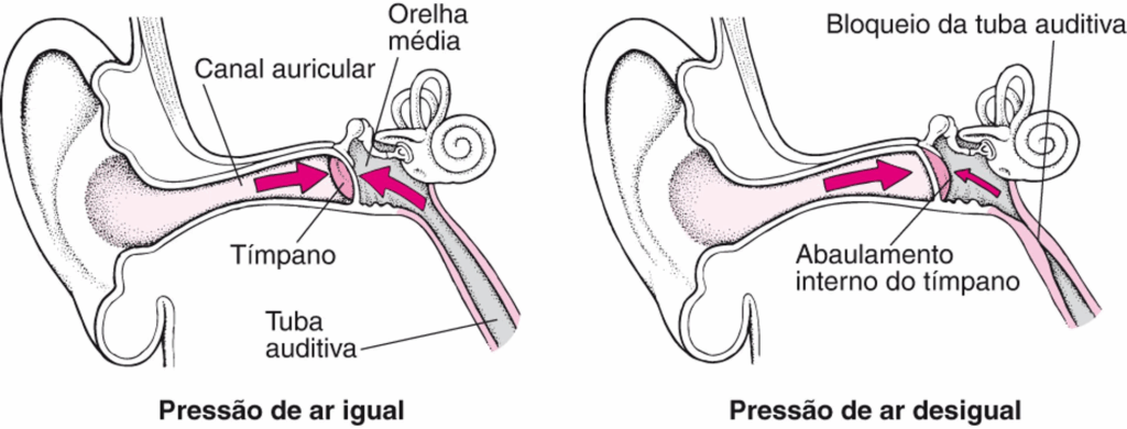 Na cabine do avião ou em estradas de serra, a pressão atmosférica muda rapidamente. Se a tuba não abre no ritmo certo, cria-se um desbalanço de pressão que puxa ou empurra o tímpano, causando dor, plenitude e redução temporária da audição. A descida costuma ser o momento mais crítico no avião, pois a pressão externa aumenta e o ouvido precisa de uma abertura eficiente da tuba para compensar.